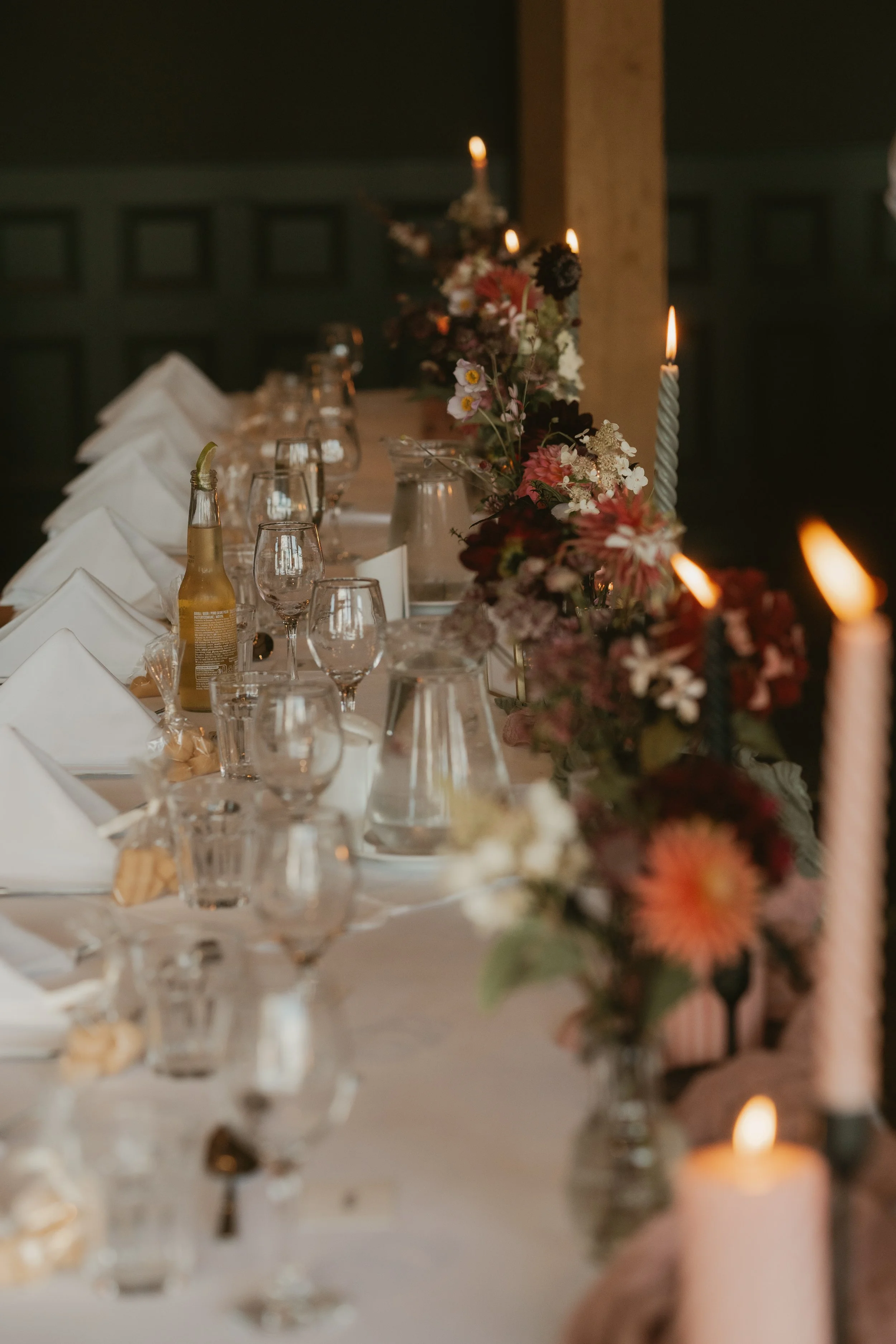 We added burgundy and green foliages for contrast and depth as well as wispy meadow flowers and wafty foliage to add a bit of movement and whimsey. Lovely wee tealights complemented the taller candles and gave off a lovely, twinkly effect. We really took Ross and Chloe’s romantic vibes and ran with it!