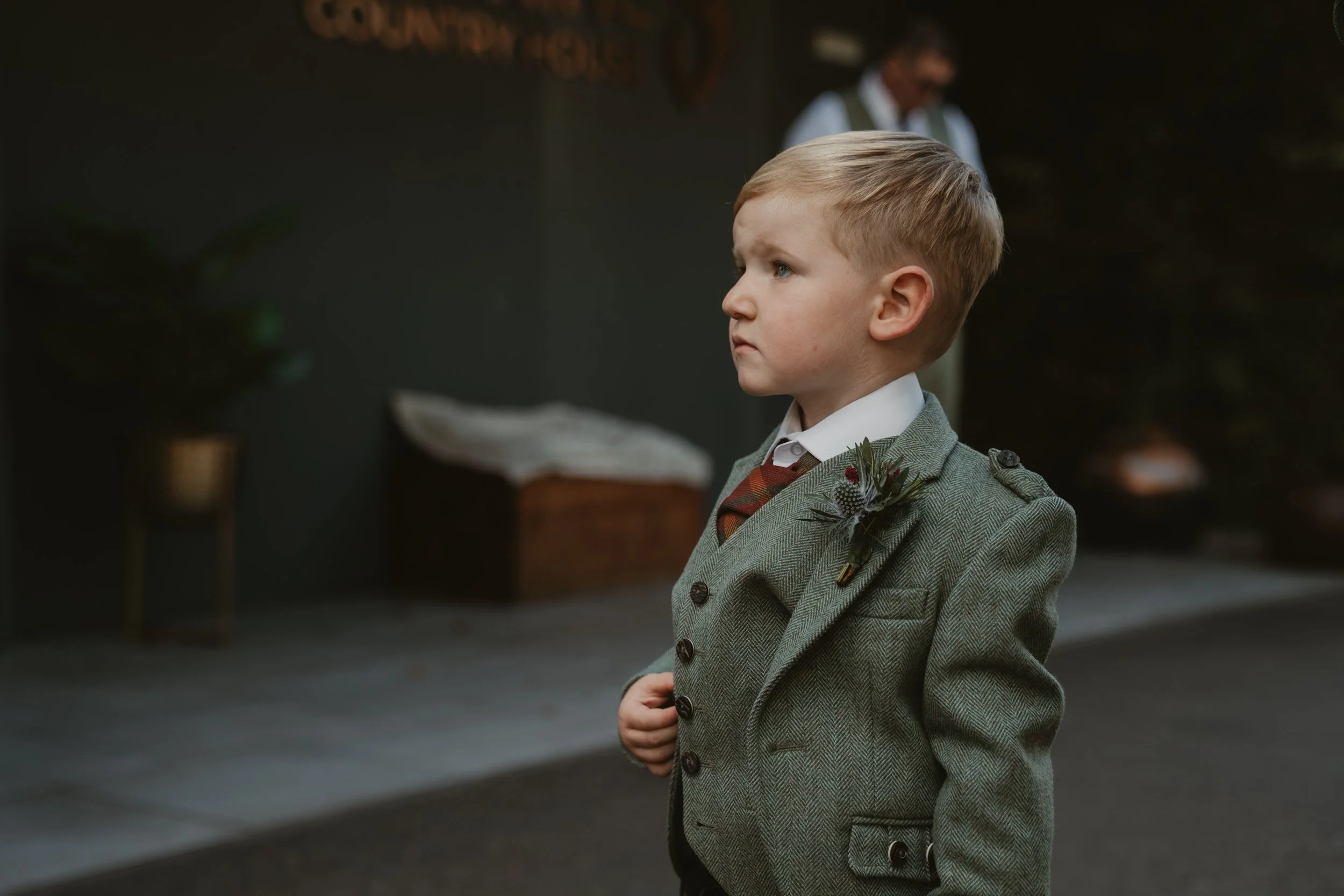 The groomsmen (and their adorable pageboy) were in traditional kilts, with tweed jackets. They opted for thistle buttonholes, an extremely popular choice for a Scot! I incorporated rosemary and sage green foliage to match the elements and colours of the wedding. The buttonholes were bound with twine for that muted colour which went well with the tweed of their outfits.
