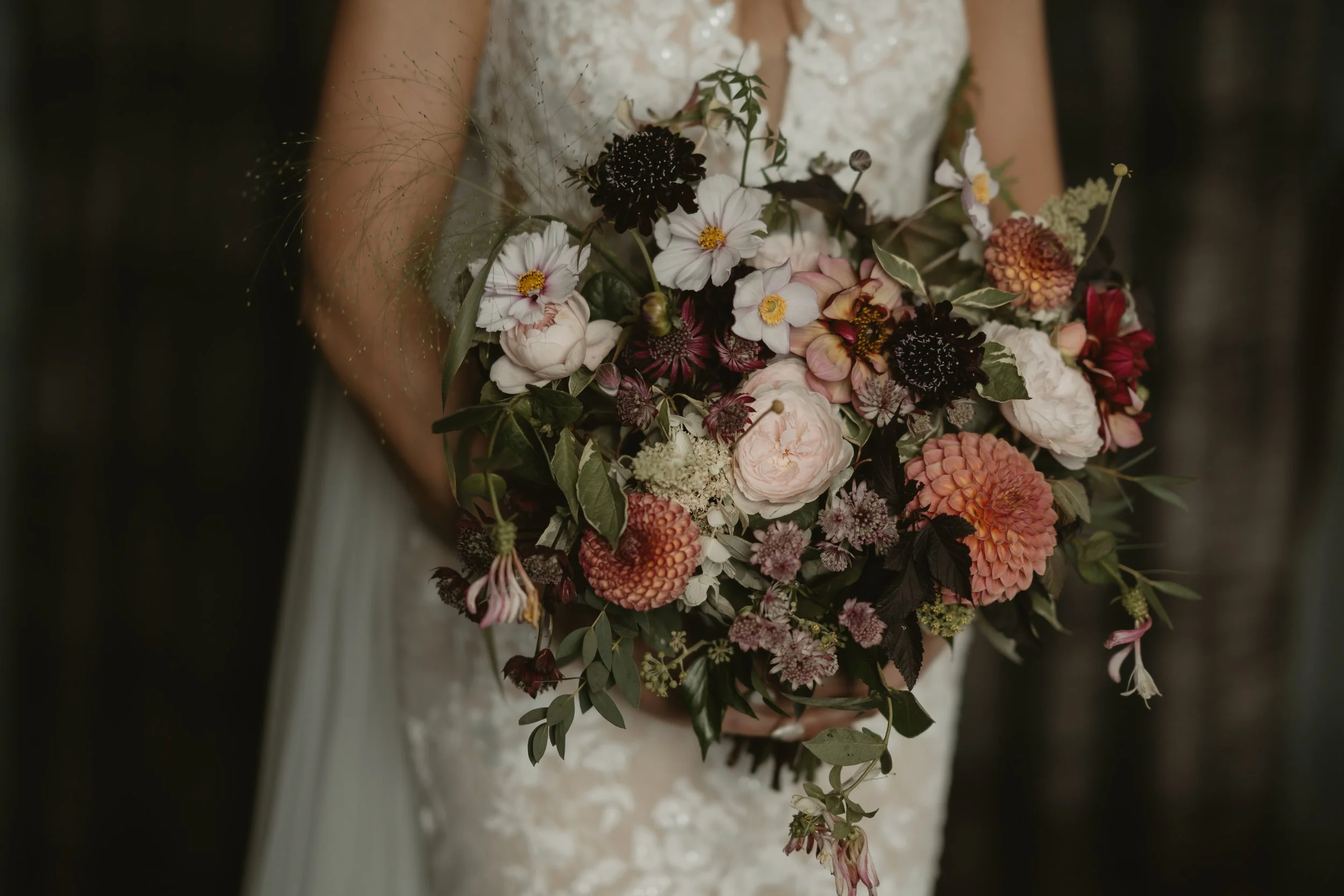 To add a bit of depth we added some burgundy foliage. It's so dark compared to the lighter tones, the contrast made for a dramatic colour combo.
