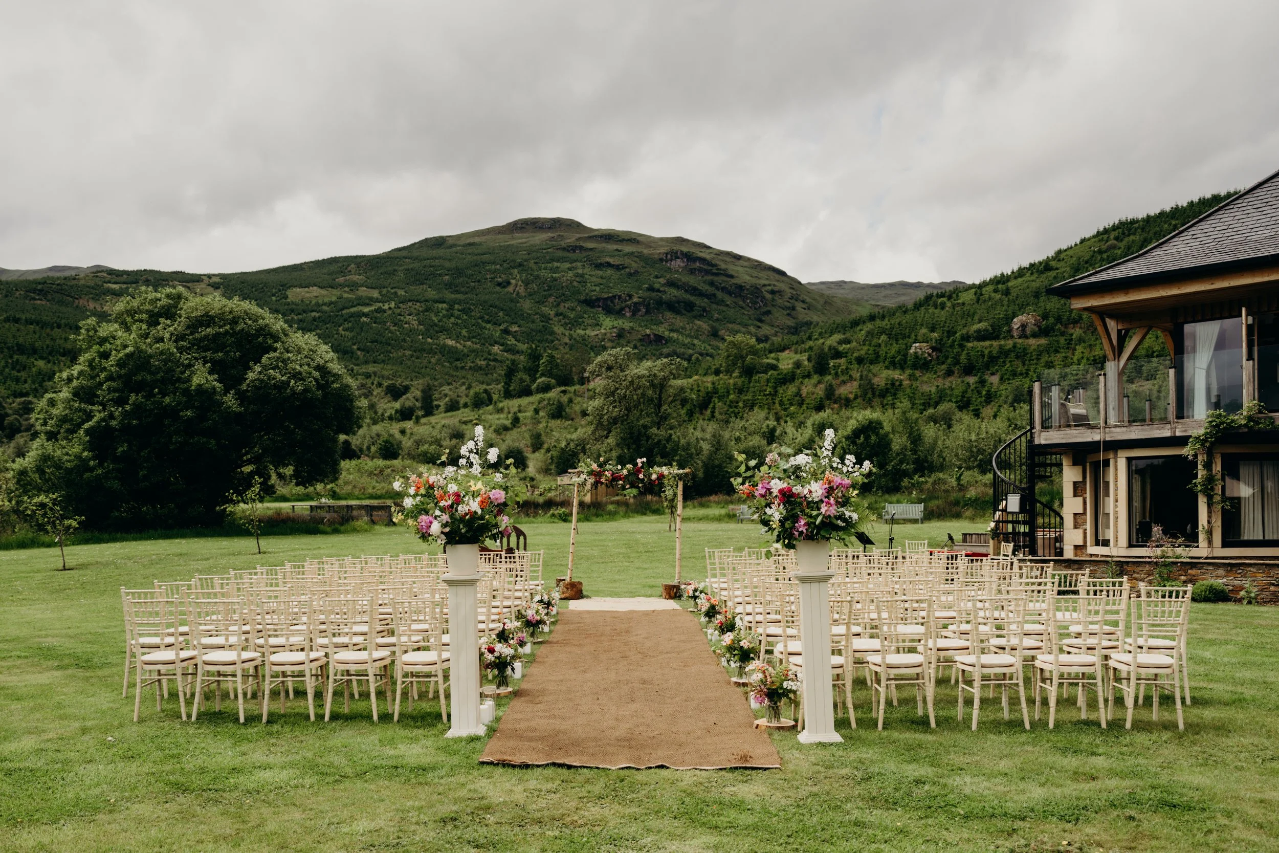 Ciara and Stuart got married on the lawn, with those panoramic views of the loch and surrounding mountains. Now, I will often get couples thinking that all they need is an amazing view, and that flowers will get ignored in favour of the scenery, or even that the flowers will distract from the Highlands. I’m going to argue against that. If you’re getting married in Scotland, in The Trossachs or places like Glencoe, then the view is just so epic that you actually need something to anchor people’s eyes to the front of the aisle. To you two. You don’t want to lose yourselves against the vast setting!