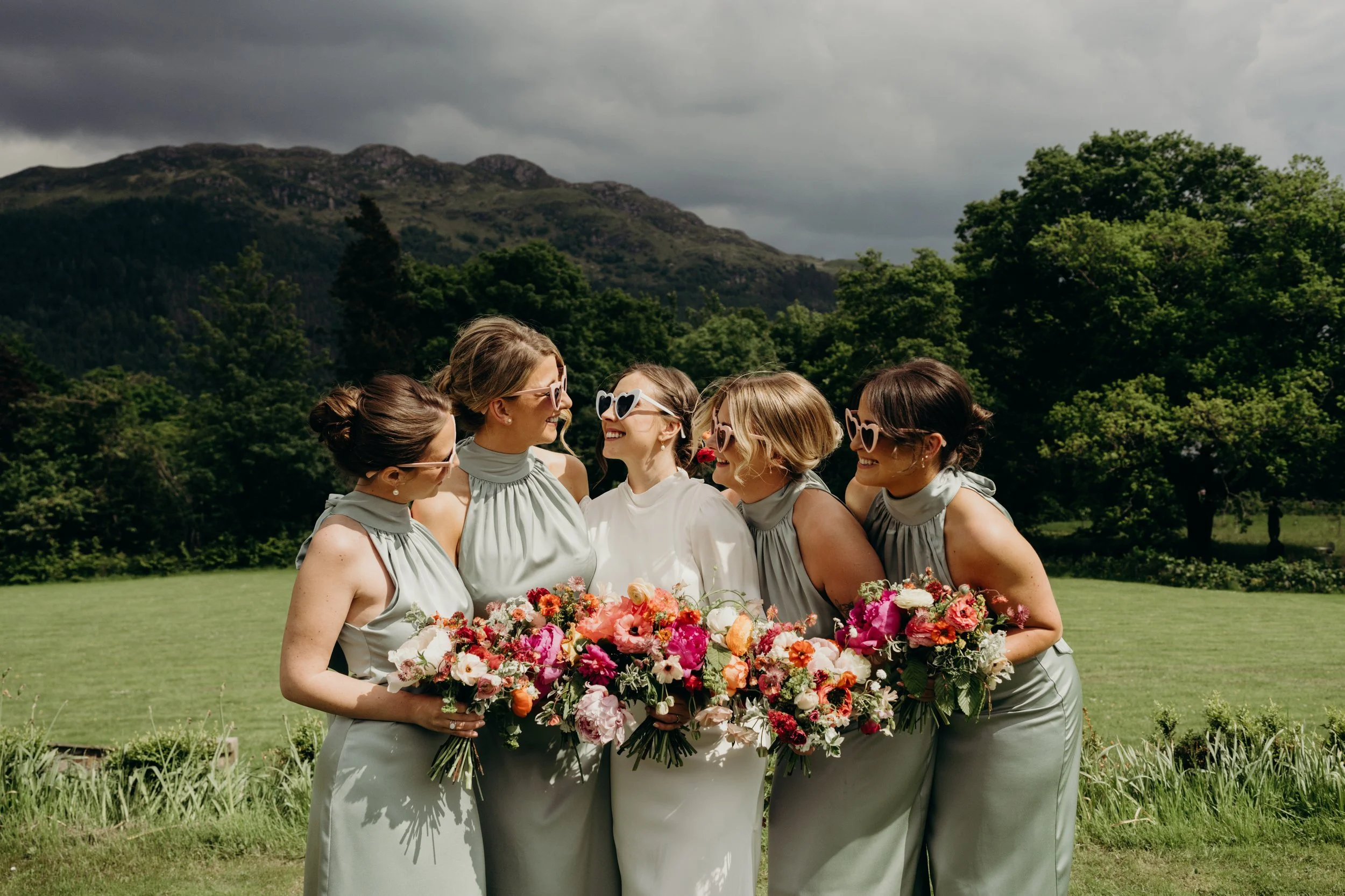 The resulting bouquet was lightly structured and wild with lots of fun, bright colours. Ciara’s hair was set off with some loose flowers woven around a low bun, adding a little pop of colour. That slightly bohemian look contrasted so well with her elegant, high neck wedding dress. Her bridesmaids carried smaller versions of her bridal bouquet. They were in sage green, letting the bright colours of the flowers sing against the lighter tones of their dresses.